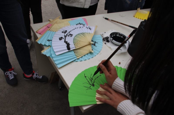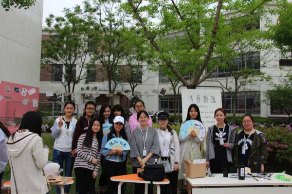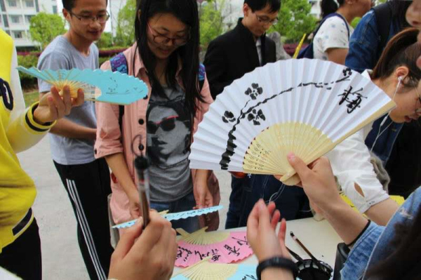 “古扇题词”可是吸引了很多同学驻足观赏,同学们拿起毛笔在扇子上恣意挥洒,扇面上,不同的字体,或苍劲有力,或圆润可爱,带着不同的心情,但同样都让扇面充满立体感,显得更加地生动活泼。墨香扇面开花,花香沁入心脾,书香怡情博彩,在春意盎然的四月融为一体,让人如醉如痴。