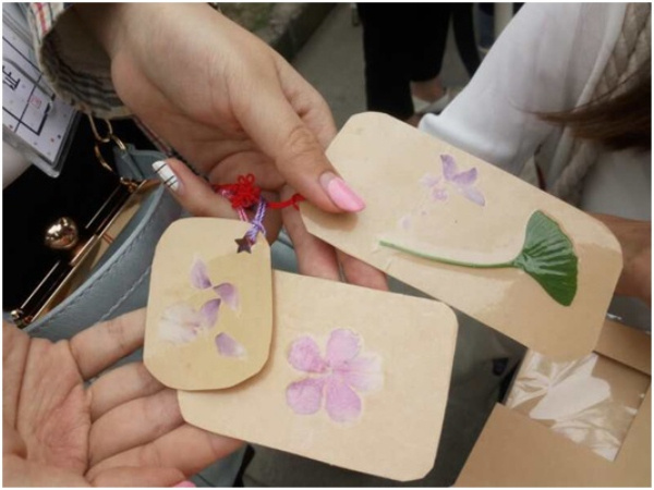 工作人员详细解说后,同学们也迫不及待地利用在校园里的樱花花瓣和卡片亲自做起手工书签来,专注而认真,亲手做的书签,精美而富有个性,粉红的花瓣点缀在纸上,满满的春天的气息。